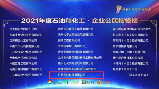 發(fā)布盛典上,同時發(fā)布了《2021年度石油和化工行業(yè)責任關(guān)懷輿情報告》和2021年度中國石油和化工行業(yè)企業(yè)公民楷模榜,廣州三業(yè)科技有限公司再度上榜為2021年中石化企業(yè)公民楷模,三業(yè)科技一直以誠信為金、創(chuàng)新為本、追求安全助力消防應(yīng)急產(chǎn)業(yè)蓬勃發(fā)展。