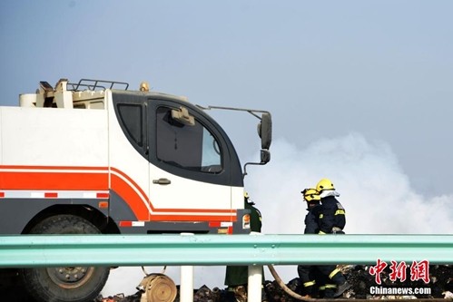 1月18日,救援人員在用大型機(jī)械清理被焚毀貨車(chē)。中新社發(fā)姜浩片來(lái)源:CNSPHOTO
