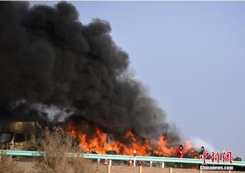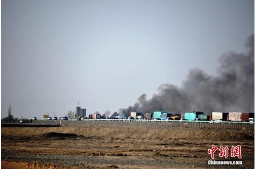 2014年01月18日,312國(guó)道新疆吐魯番地區(qū)鄯善縣境內(nèi)發(fā)生的車(chē)禍現(xiàn)場(chǎng),火光沖天,濃煙滾滾。中新社發(fā)姜浩圖片來(lái)源:CNSPHOTO