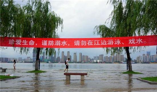 為保證市民安全,親水平臺拉起了警戒線,“江水湍急,為了您的安全,請勿游泳、戲水”的安全提示橫幅多處可見,提醒市民游玩時(shí)注意安全,但仍可以看到不少市民在江中游泳。