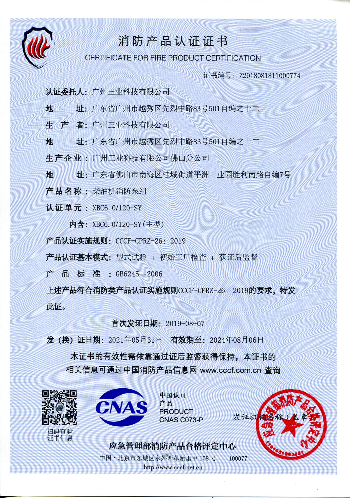 廣州三業(yè)消防產(chǎn)品XBC6.0/120-SY柴油機(jī)消防泵組經(jīng)公安部消防產(chǎn)品合格評定中心批準(zhǔn),獲得“中國國家強(qiáng)制生產(chǎn)品CCC認(rèn)證證書”。