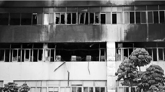 昨日上午11時,記者趕到起火現(xiàn)場時大火已被撲滅,工廠3-6層的外墻被濃煙熏黑,3樓車間的玻璃窗破裂,窗框脫落。據(jù)目擊者提供的視頻,大火在3樓車間燒起,黑煙上涌。“早上準備上班時收到通知說停工。”工人說,公司尚未確定何時復(fù)工。