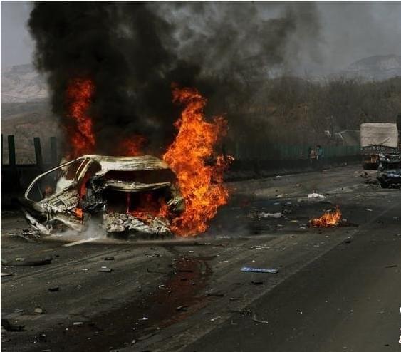 被燒成剩骨頭架子的三廂轎車被撞的已成兩廂轎車。