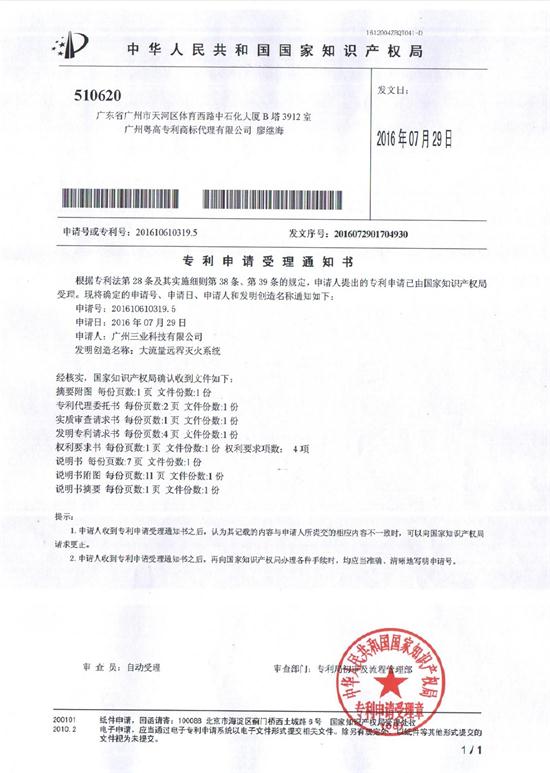 7月29日,公司申報(bào)《大流量遠(yuǎn)程滅火系統(tǒng)》發(fā)明專利,經(jīng)國(guó)家知識(shí)產(chǎn)權(quán)局給予受理,專利號(hào):201610610319.5,發(fā)明人:鄭全、鄭浩、鄭建偉。