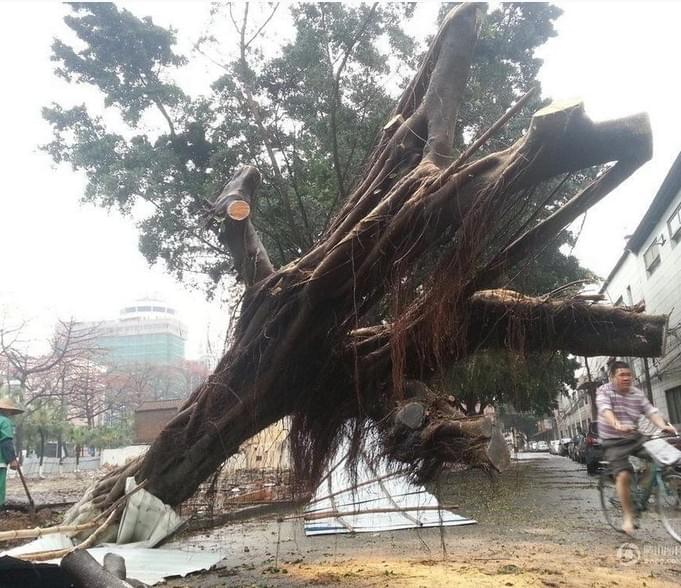 2014年3月30日臨晨6點(diǎn)左右,廣東省佛山市遭受了多年未見(jiàn)的冰雹襲擊,順德大良石洛路這顆二三十年樹(shù)齡的大榕樹(shù)被風(fēng)吹倒。(鄒忠輝)