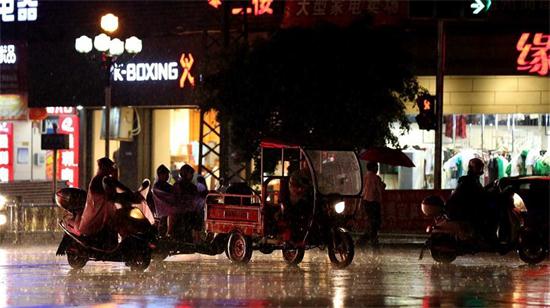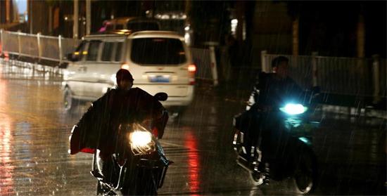 5月19日晚,在廣西柳州市融安縣長安鎮(zhèn)桔鄉(xiāng)路,市民在雨中騎車出行。