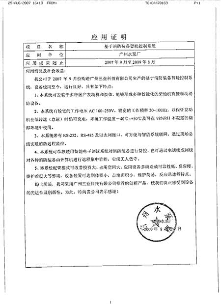 消防裝備智能控制系統(tǒng)的客戶見證,廣州水泵廠于2007年至2009年使用我司提供的消防裝備智能控制系統(tǒng)以來,運(yùn)行良好,使 企業(yè)感受到我司設(shè)備的先進(jìn)性和創(chuàng)新性 ,并給與感謝。