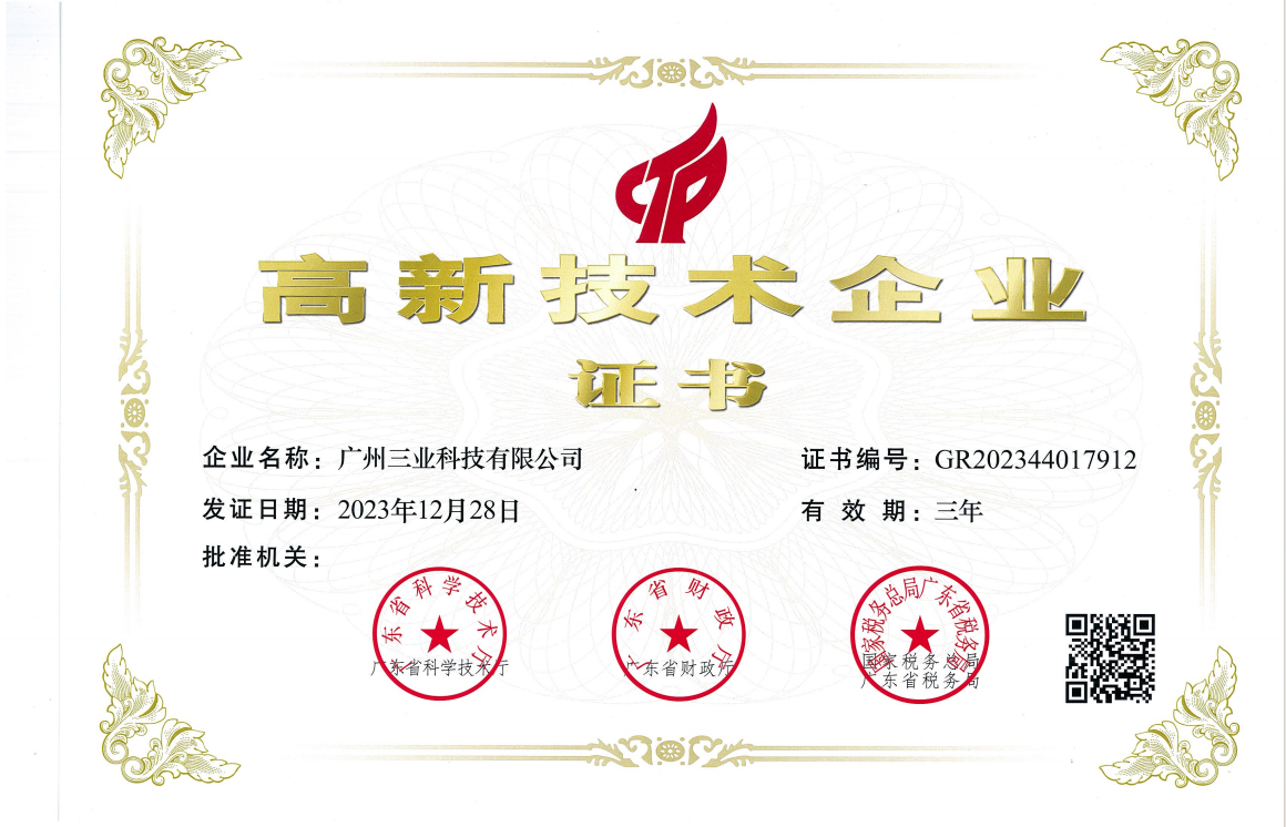 廣州三業(yè)科技通過了2023年廣東省第一批高新技術(shù)企業(yè)認(rèn)定評(píng)審,并獲得“高新技術(shù)企業(yè)證書”(編號(hào):GR201744005123)。