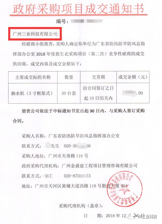 廣州三業(yè)科技有限公司,在廣東省防汛防旱防風(fēng)總指揮部辦公室2018年度救生衣采購(gòu)項(xiàng)目中的抽水機(jī)項(xiàng)目,經(jīng)過多方磋商,最終中標(biāo)!