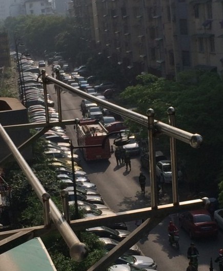 接警后,消防迅速趕往現(xiàn)場(chǎng)撲救。道路停車(chē)較多,消防車(chē)進(jìn)入也難。
