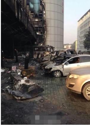 2014年3月16日凌晨,湖北黃石市二醫(yī)院住院樓發(fā)生火災(zāi),造成4人死亡。據(jù)當(dāng)?shù)毓膊块T通報,火災(zāi)發(fā)生在4時20分許。著火層為住院樓一樓服務(wù)大廳,過火面積200多平方米?;馂?zāi)造成一人現(xiàn)場死亡,一名病人跳樓后經(jīng)搶救無效死亡,另有2名住院重癥病人轉(zhuǎn)移后死亡。事故原因正在進一步調(diào)查之中。圖為發(fā)生火災(zāi)后的醫(yī)院一樓大廳和車輛燒毀嚴(yán)重。(手機拍攝)中新社發(fā) 馬芙蓉 攝