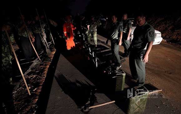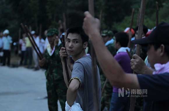 昨晚18時(shí)30分左右,全服武裝的民兵投入山林撲救。由于山頂風(fēng)大,火借風(fēng)勢(shì),有蔓延的趨勢(shì),江海、江門兩級(jí)政府組織撲救力量控制火勢(shì)。截至昨晚19時(shí) 許,南都記者撤離現(xiàn)場(chǎng)時(shí),大牛山山頭的火勢(shì)未發(fā)現(xiàn)蔓延的趨勢(shì)?,F(xiàn)場(chǎng)的消防、民警、民兵等都表示,按上級(jí)要求,要通宵撲救。圖為武裝部組織的民兵救援隊(duì)帶著 鼓風(fēng)機(jī)在半山坡待命。