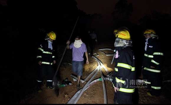 起火的山林靠近茶庵寺風(fēng)景區(qū),挨著江海區(qū)外海街道的金溪村,山頭叫大牛山。記者沿著消防水帶攀爬了三四百米到達(dá)山頂,六七名蓬江消防一中隊(duì)的戰(zhàn)士正拿著兩 根水管超火點(diǎn)噴水。“現(xiàn)在大火從三面向這個(gè)山頭靠近,我們要控制火勢(shì)蔓延。”一名消防戰(zhàn)士說(shuō)。“下午5點(diǎn)40分,我們接到支隊(duì)的命令來(lái)支援。”現(xiàn)場(chǎng)指揮的 黃姓中隊(duì)長(zhǎng)說(shuō),除了江海消防官兵已經(jīng)投入撲救外,目前江門市消防支隊(duì)已調(diào)派蓬江、新會(huì)、鶴山三地的消防力量到達(dá)現(xiàn)場(chǎng)支援。圖為位于著火點(diǎn)最近的消防員們等 待山下往管道中送水。