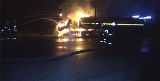 凌晨1時40分,開封尉氏縣消防大隊接到報警,該縣尉鄢路一輛油罐車與一輛裝有冷凍食品貨車發(fā)生追尾,油罐車罐體前側破損,車頭與罐體前側猛烈燃燒。