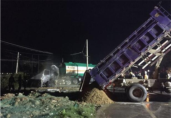 凌晨2時17分,明火被撲滅,但油罐車持續(xù)發(fā)生泄漏,撒落的汽油流散在地面上,在空氣中揮發(fā)形成易燃易爆氣體,現(xiàn)場指揮員下令救援組用細沙形成“包圍圈”繼續(xù)圍堵流散 油品,并利用沙土覆蓋的方法對流散油品進行掩埋。