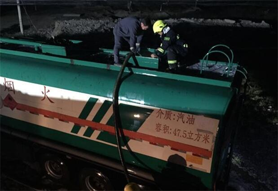 緊接著,指揮員制定倒灌移油方案。凌晨2時40分,當地公安部門調派的一輛油罐車到場,采取倒罐抽油的方式,連接好地線,用不導電體管道對事故車輛的未泄漏的汽油進行 倒罐,同時用單干線兩只水槍對罐體降溫、驅散汽油蒸汽。