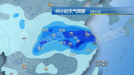此輪降雨將重點影響湖北、河南南部、安徽、江蘇南部、上海、浙江北部一帶。31日,尤其是31日夜間為降雨的鼎盛階段,預(yù)計將伴隨短時強降雨等強對流天氣出現(xiàn)。