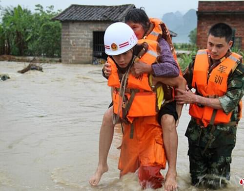 據(jù)統(tǒng)計,5月21日以來,廣西多地出現(xiàn)強降雨,部分地區(qū)大到暴雨,造成洪澇災(zāi)害。截至5月22日11時,災(zāi)害造成4萬余人受災(zāi),因災(zāi)死亡1人,直接經(jīng)濟損失1400萬元人民幣。圖為消防官兵營救群眾現(xiàn)場。