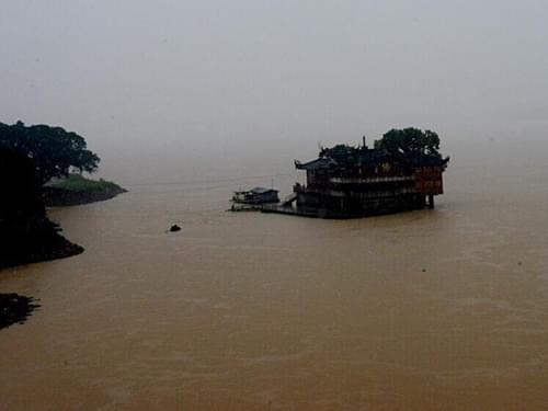 5月22日,受連日福建強降雨影響,位于福建福州閩江洪塘大橋附近一個江心洲上的金山寺被洪水包圍。