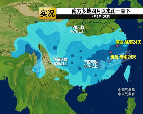 4月1日-25日降水日數(shù)實況。其中江西貴溪、浙江淳安4月以來只有1天沒下雨。