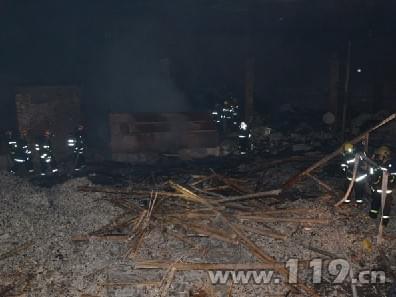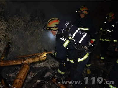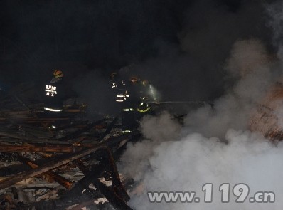 消防官兵到達(dá)現(xiàn)場(chǎng)時(shí),羽絨廠已經(jīng)陷入一片火海,廠房上空濃煙滾滾。羽絨廠廠房房頂已經(jīng)被完全燒塌,廠房中間只剩下幾根紅磚砌的立柱,廠房右墻已經(jīng)倒塌,燒焦的殘余物、制作羽絨的原料隨處可見。更危險(xiǎn)的是,毗鄰著火羽絨廠的是一家塑料制品廠,火勢(shì)一旦向塑料制品廠蔓延,后果將不堪設(shè)想。