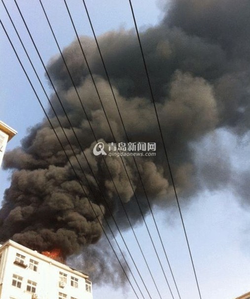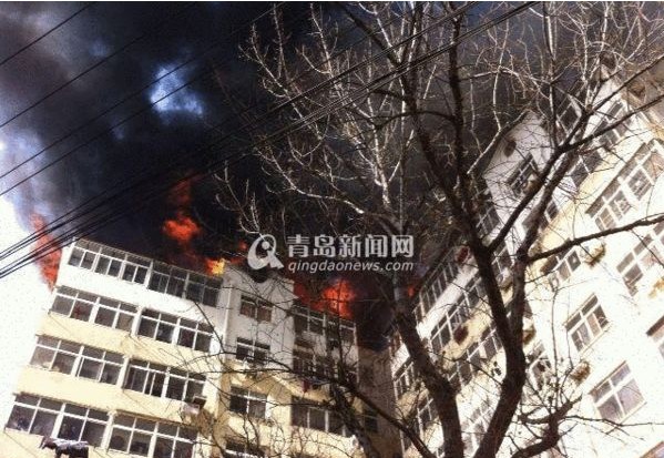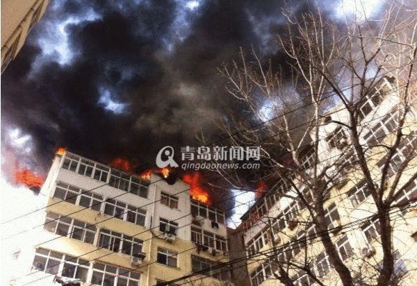 青島臺柳路居民樓突發(fā)大火 殃及周邊樓(圖)