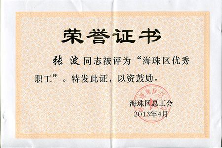 (廣州市海珠區(qū)優(yōu)秀職工榮譽證書)