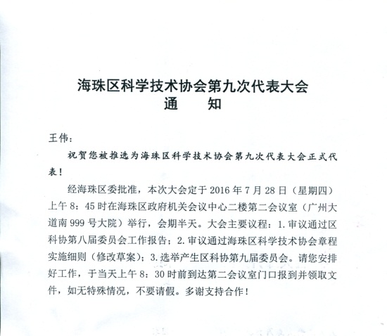 熱烈慶賀我公司應(yīng)用總工程師王偉當(dāng)選海珠區(qū)科協(xié)第九屆代表