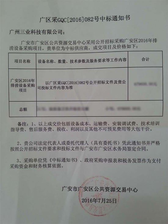三業(yè)科技”排澇設(shè)備”又中標(biāo)了 --四川省廣安區(qū)水務(wù)局2016年排澇設(shè)備采購項目公開招標(biāo)結(jié)果公告