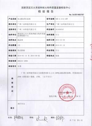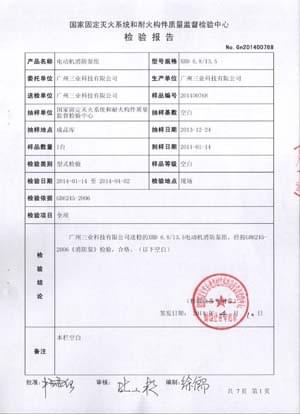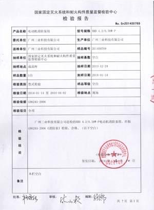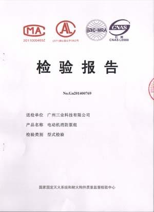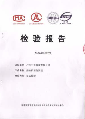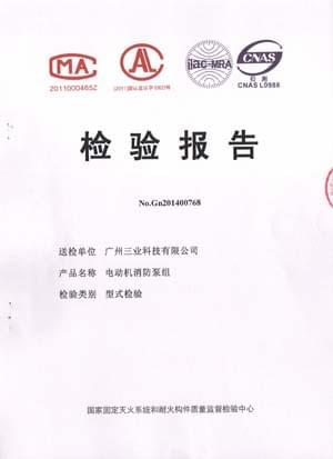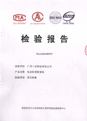 2014年4月10日,廣州三業(yè)科技有限公司四套設(shè)備通過國家滅火系統(tǒng)和耐火構(gòu)件質(zhì)量監(jiān)督檢驗(yàn)中心的檢驗(yàn)測試,送檢的型號為XBD 6.8/0.55W電動機(jī)消防泵組、型號為XBD 6.5/13.5電動機(jī)消防泵組、型號為XBD 4.2/0.58W—P電動機(jī)消防泵組、型號為XBC 12.3/85—P柴油機(jī)消防泵組,經(jīng)按GB6245—2006《消防泵》檢驗(yàn)合格。