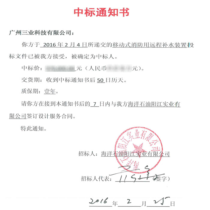 三業(yè)科技迎來(lái)了猴年的第二份中標(biāo)通知書(shū),我們的“移動(dòng)式消防用遠(yuǎn)程補(bǔ)水裝置”中標(biāo)“海洋石油陽(yáng)江實(shí)業(yè)有限公司”項(xiàng)目。