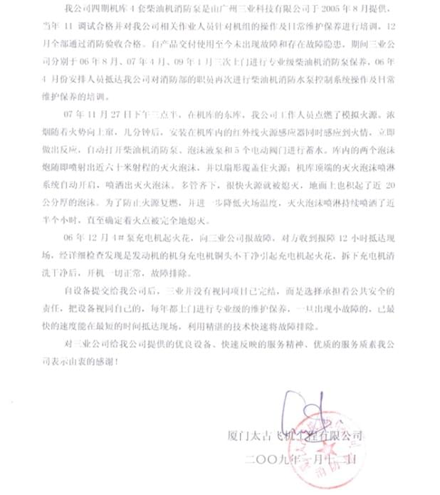 在太古(廈門)A380飛機(jī)維修庫項(xiàng)目之前,國內(nèi)各大機(jī)場的維修機(jī)庫設(shè)備基本上都采用國外進(jìn)口設(shè)備,尤其是作為飛機(jī)檢修、保養(yǎng)的最后保障體系——消防安全系統(tǒng)。由廣州三業(yè)科技有限公司擁有自主知識產(chǎn)權(quán)的智能柴油機(jī)消防水泵產(chǎn)品,憑借國內(nèi)領(lǐng)先的技術(shù)含量和自有的國家專利的應(yīng)用,加上智能鑄就安全的現(xiàn)代理念和爭當(dāng)智能專家的責(zé)任感,使產(chǎn)品完全滿足服務(wù)于安全及確保設(shè)備自身安全的要求。三業(yè)人所研制的智能柴油機(jī)消防泵首次進(jìn)入國內(nèi)機(jī)場,改寫了國人不能制造高標(biāo)準(zhǔn)消防設(shè)備的歷史,三業(yè)公司的產(chǎn)品也因此得到了廣大業(yè)界和專家們的肯定和贊同。