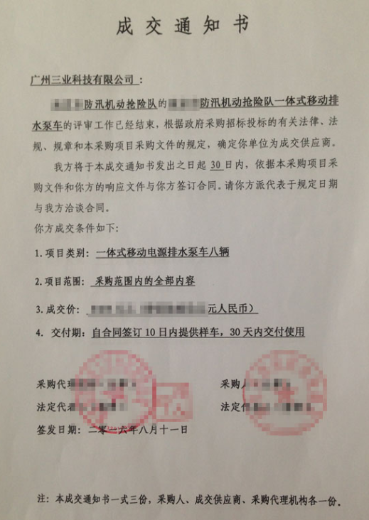 8月,我公司又收到某市防汛機(jī)動(dòng)搶險(xiǎn)隊(duì)的《成交通知書》,這次是中標(biāo)的是8輛移動(dòng)電源排水泵車的采購項(xiàng)目。