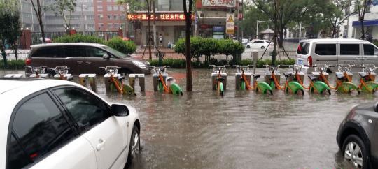 在太原市區(qū)看到,在該市主干道的一處立交橋橋底,積水最深處幾乎將小轎車(chē)全部淹沒(méi);停在雙塔西街路邊的公共自行車(chē),早已被雨水漫過(guò);太原路邊部分交通設(shè)施被嚴(yán)重?fù)p壞,一些交通指示牌倒地。