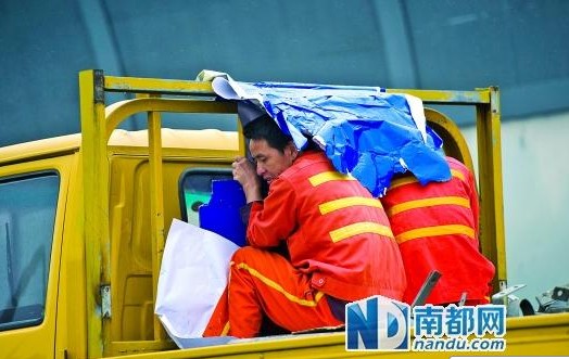 大雨中,工程車上工人用帆布遮著身子避雨。南都記者 陳文才 攝