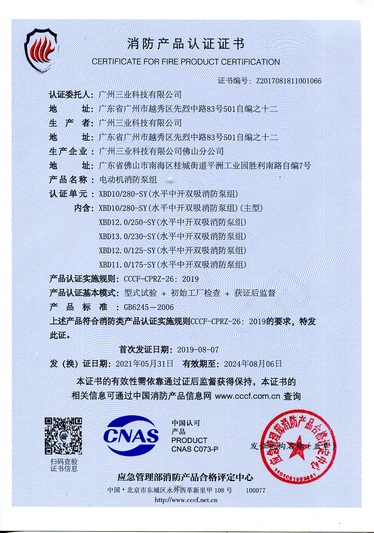 三業(yè)科技XBD10/280電動(dòng)機(jī)消防泵組順利通過(guò)中國(guó)質(zhì)量認(rèn)證中心檢查小組的評(píng)審檢查,榮獲《中國(guó)國(guó)家強(qiáng)制性產(chǎn)品認(rèn)證證書》。