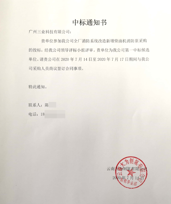經(jīng)云南大為制氨有限公司領(lǐng)導(dǎo)評標小組評審,廣州三業(yè)科技有限公司成為其公司消防系統(tǒng)改造新增柴油機消防泵采購項目的第一中標候選單位。