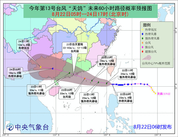 降水預(yù)報:8月22日14時至8月23日14時,廣東南部、福建沿海、浙江東南部沿海、臺灣東南部和西北部等地有大到暴雨,廣東沿海、臺灣東南部局地有大暴雨(100-190毫米)。