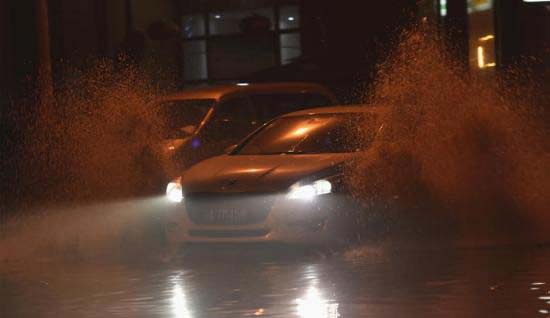 4月2日晚,重慶主城電閃雷鳴突降暴雨,位于該市江北區(qū)首創(chuàng)鴻恩生活社區(qū)車庫旁的路面低洼處出現(xiàn)積水現(xiàn)象,致??吭诼愤叺能囕v被水淹沒。圖為市民開車淌水前行。