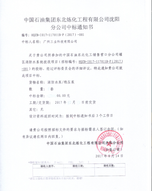 三業(yè)在中石油東北煉化工程沈陽(yáng)分公司招標(biāo)項(xiàng)目中標(biāo)