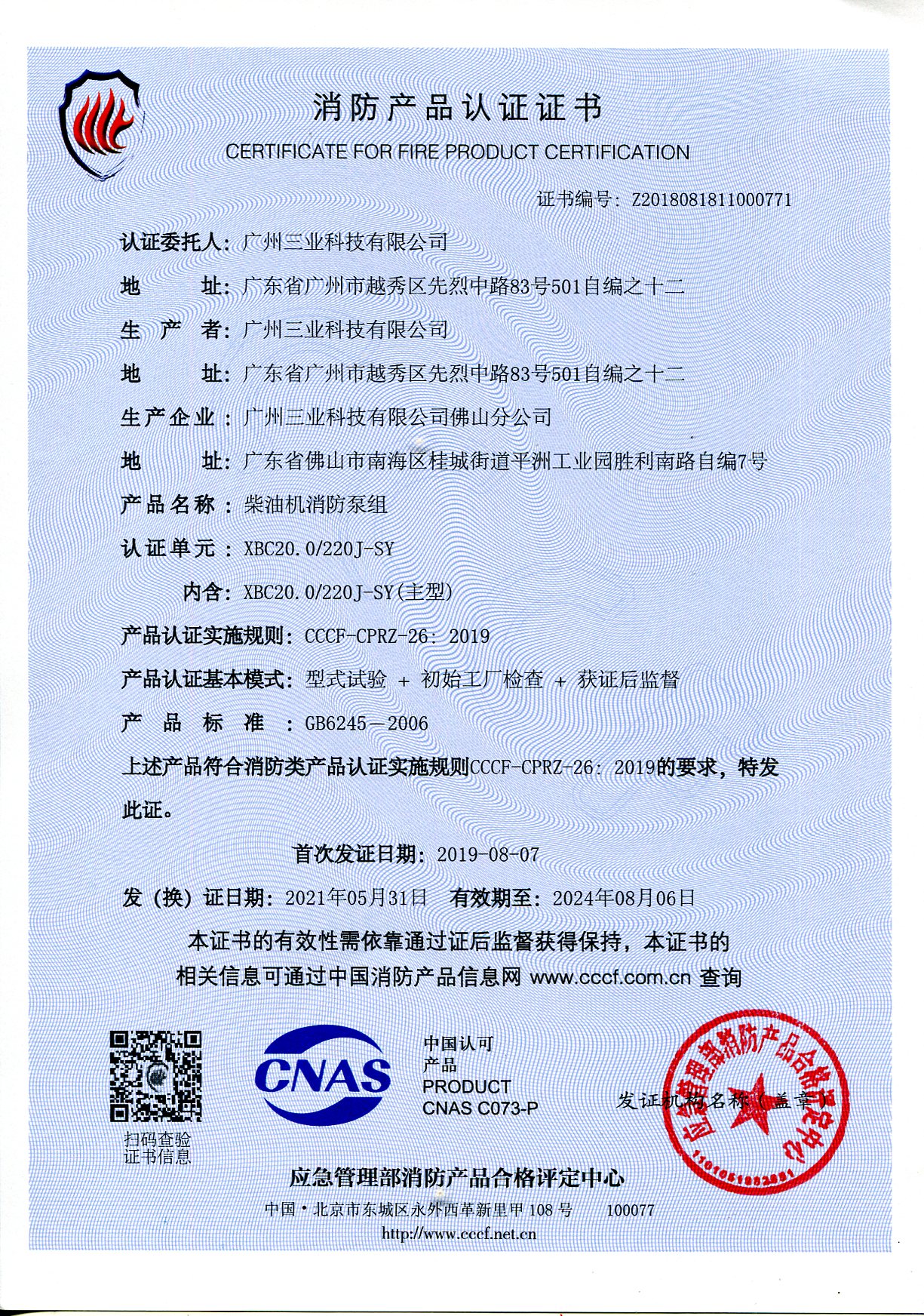 廣州三業(yè)消防產(chǎn)品XBC20.0/220J-SY柴油機消防泵組經(jīng)公安部消防產(chǎn)品合格評定中心批準(zhǔn),獲得“中國國家強制生產(chǎn)品CCC認證證書”。