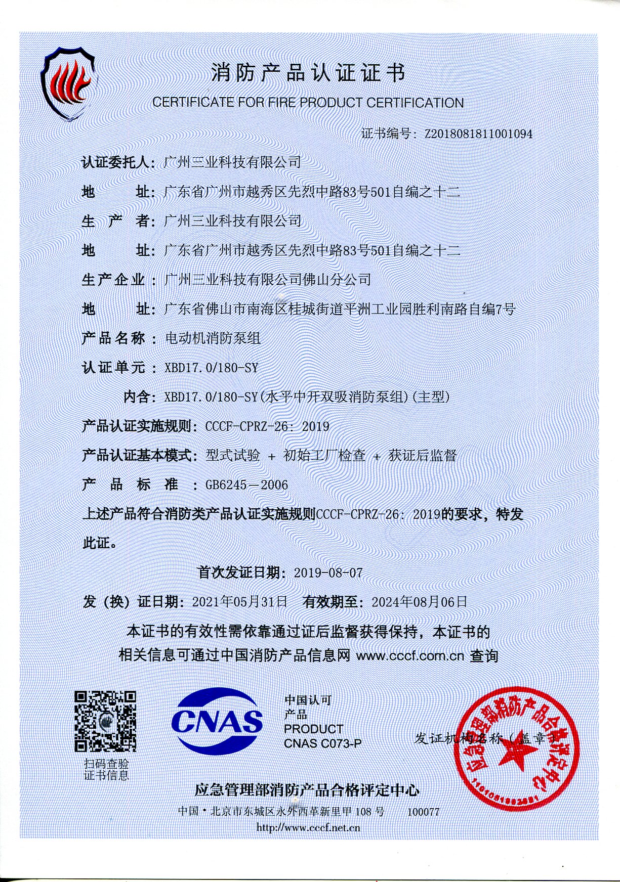 廣州三業(yè)消防產(chǎn)品XBD17.0/180-SY電動機消防泵組經(jīng)公安部消防產(chǎn)品合格評定中心批準,獲得“中國國家強制生產(chǎn)品CCC認證證書”。