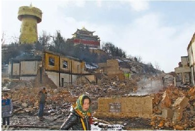 圖為12日上午,被焚燒后的獨(dú)克宗古城現(xiàn)場。