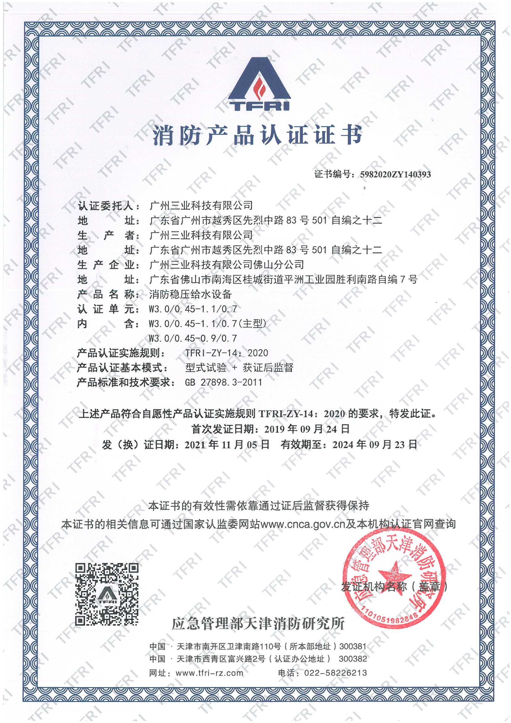恭喜我司生產(chǎn)的消防穩(wěn)壓給水設(shè)備型號:W3.0/0.45-0.9/07、W3.0/0.45-0.0/0.7與W4.0/1.5-SY符合自愿性產(chǎn)品認(rèn)證實(shí)施規(guī)則NCFE-GXRZ-15:2019的要求,由此可獲得由國家消防工程技術(shù)研究中心頒發(fā)的型號產(chǎn)品認(rèn)證證書。