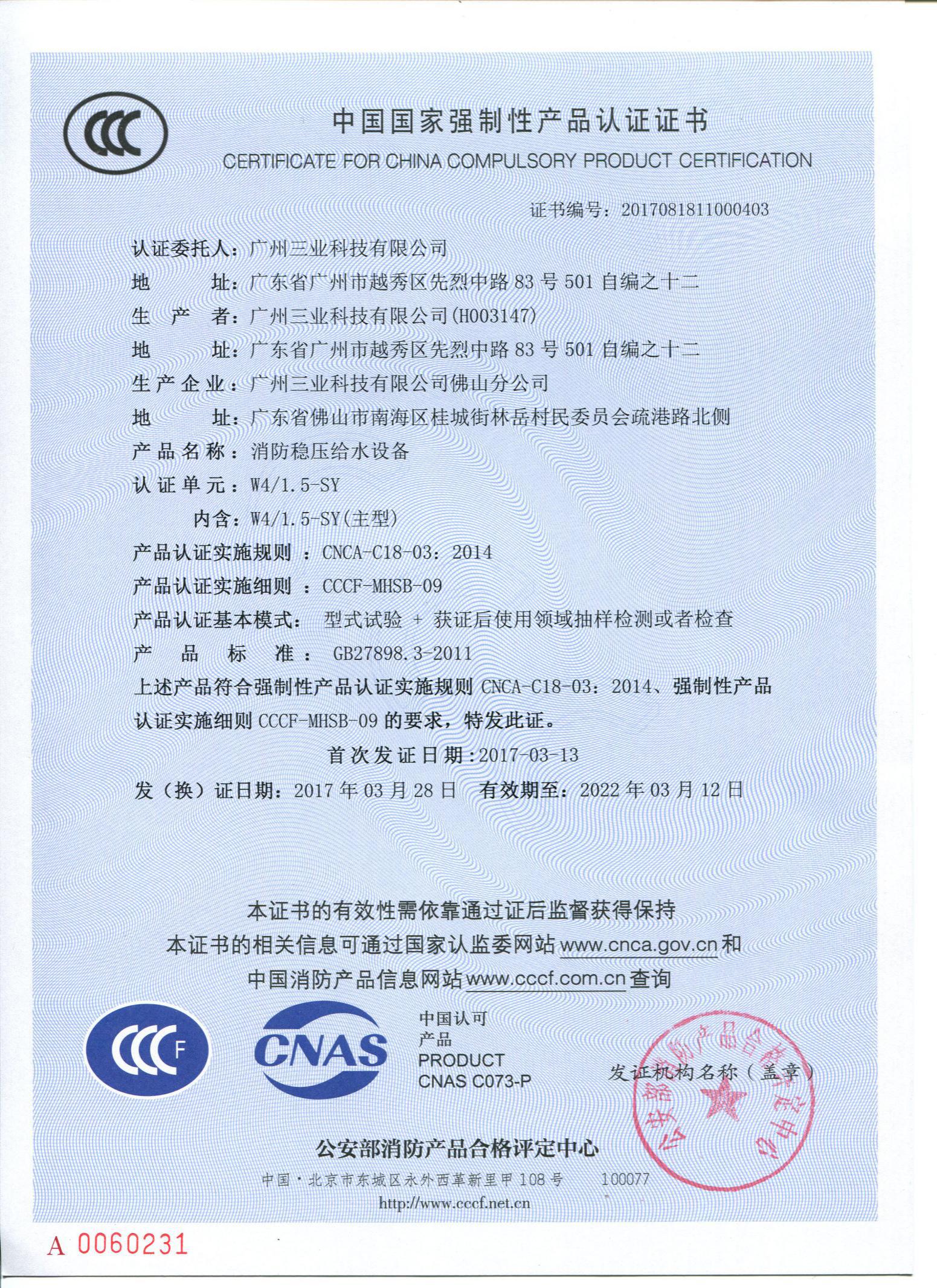 6、消防穩(wěn)壓設(shè)備CCCF證書(shū)