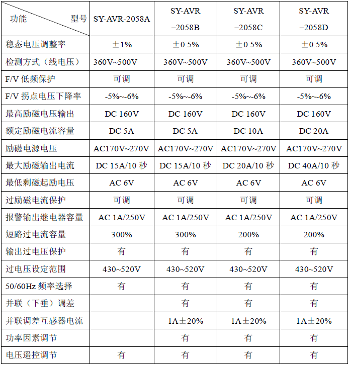 | SY-AVR-2058自動電壓調節(jié)器參數(shù)表 |